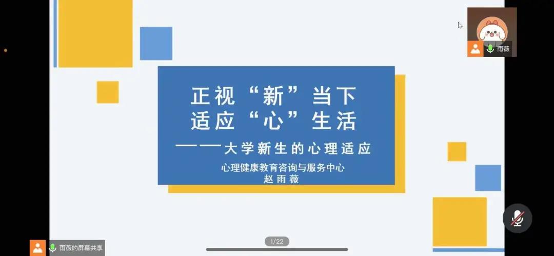 9月10日上午9:00,探花视频 2021级本科新生入学教育系列活动之心理健康讲座于线上顺利举行。为了促进新生的心理健康教育普及,给予新生思想心理关怀,引导他们积极主动探索良好的人际关系,更好融入校园生活,探花视频 邀请到心理健康教育咨询与服务中心赵雨薇老师做主题讲座。此次讲座主题为:正视“新”当下,适应“心”生活。赵雨薇老师用平易近人的语言开篇,从社会因素、体质因素、素质因素三个方面对大学生普遍存在的心理问...