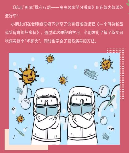 他们紧密结合新型冠状病毒感染肺炎疫情,围绕五大领域教育系统化的为幼儿设计了《一个叫新型冠状病毒的坏家伙》、《洗手歌》、《武汉加油》、《我做你做》、《棒棒棒》等学前教育在线课程,并计划在抗击疫情期间有序实施开展,辅助幼儿园做到停学不停课。疫情当下,身在长春的专业学前教师们每天通过在线教学平台走进了各地幼儿家庭,在家长的极力配合下,共促幼儿健康成长。每天课程结束后,家长们与幼儿一起动手完成老师布置的家庭活动任务,学知识、抗“新冠”,近万名幼儿个个成为了抗击疫情“小能手”。当从一个个刚刚咿呀学语的3岁孩子口中说出“打败新型冠状病毒这个坏家伙,我要不出门,勤洗手,帮助妈妈开开窗、通通风、勤打扫、消消毒,出门正确戴口罩”的时候,就是这群奋战在特殊抗疫战线上的“战士们”最大的快慰。与此同时,他们还利用门户网站、微信公众号向广大群众传达党中央和各级政府通知通告,征集各类科普知识进行广谱宣传,及时转发全国及吉林省的疫情通报、推广抗击疫情最新方式方法等重要信息。目前,在各地幼儿园的积极配合下,这项公益活动又吸纳了各地近3000余个幼儿家庭加入,服务覆盖面仍在逐步扩大。