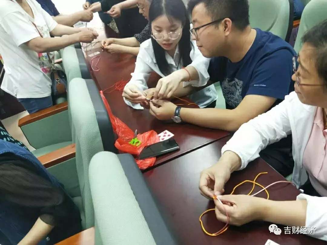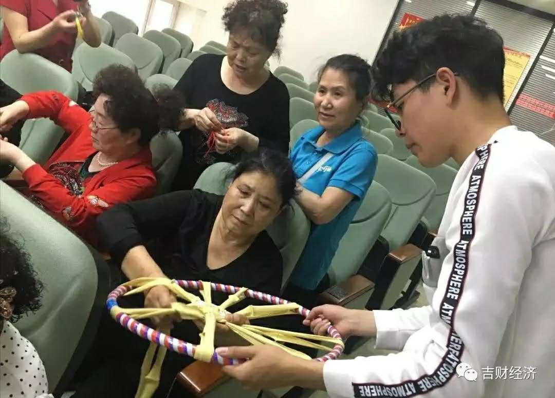 编织端午节手链:志愿者通过手把手的方式教老人编织,即使过程有些复杂,但每名志愿者耐心讲解,活动中老人也积极参与,其乐融融。
