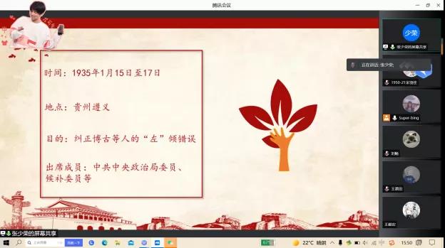 随后,探花视频 1847班党员张少荣同学带我们了解遵义会议。1935年1月,当长征的队伍走到遵义,中国革命也面临关键的转折点。在红军第五次反“围剿”失败和长征初期严重受挫的历史时刻,就在遵义一座二层小楼里,召开了一个具有里程碑意义的重要会议——遵义会议。