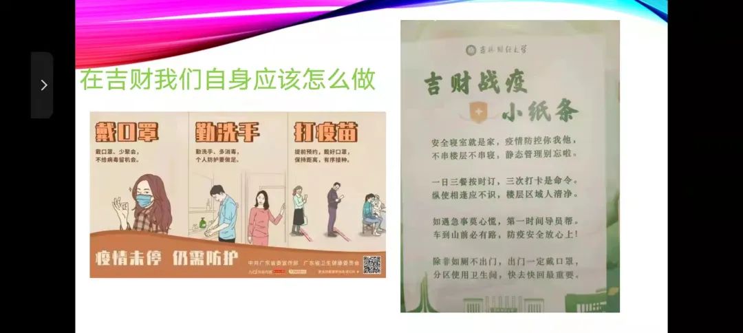 团课伊始,主讲人向同学们讲述了当前我省的疫情状况,阐明严格防控的意义,按照学校的部署,提出疫情防控的相关要求。随后,主讲人呼吁同学们,作为新时代新青年要有担当和勇气,同学们要在保证个人健康的前提下,积极承担相应的责任,用自己的实际行动传递抗疫正能量,在这场疫情攻坚战中展现青年担当,共同维护安全文明的校园。