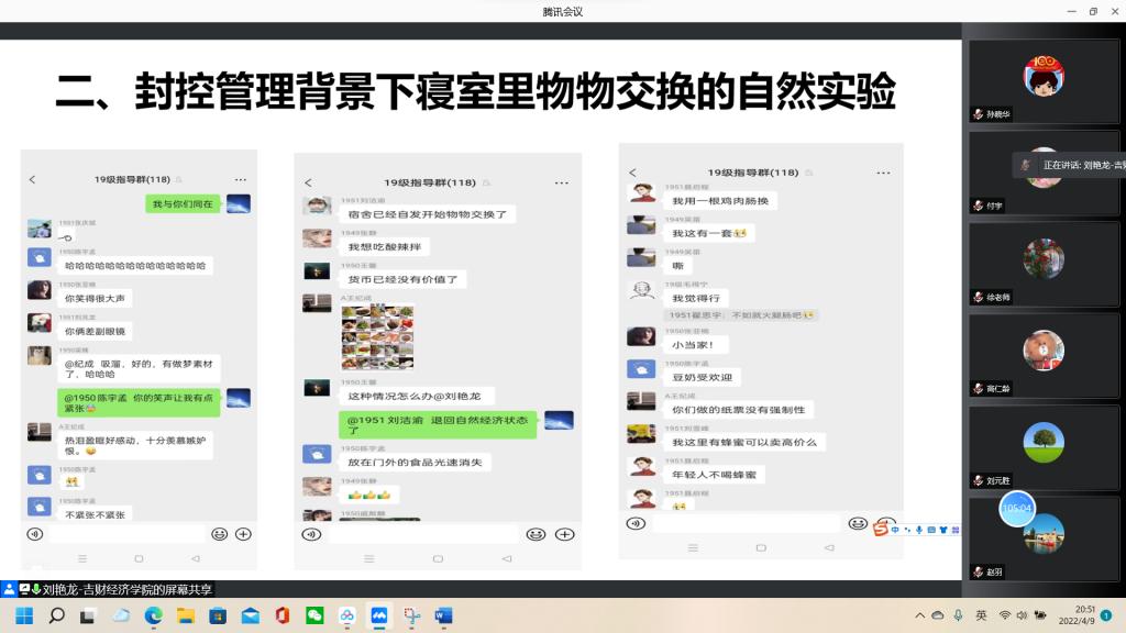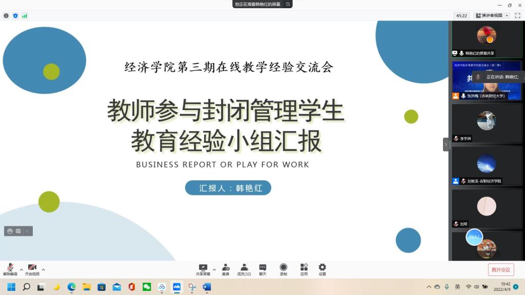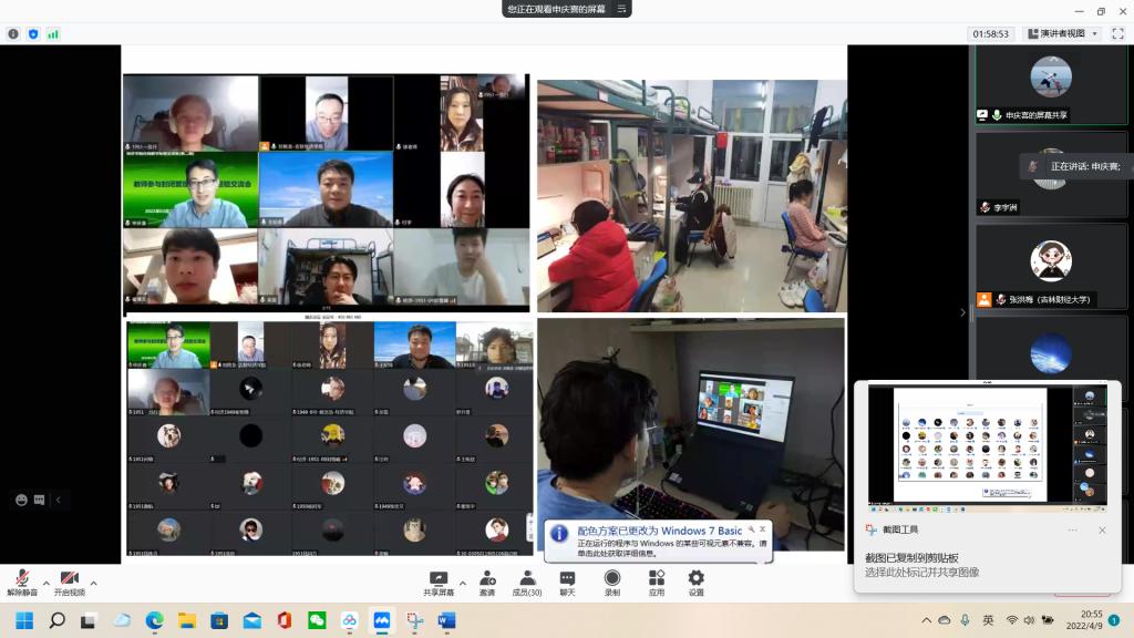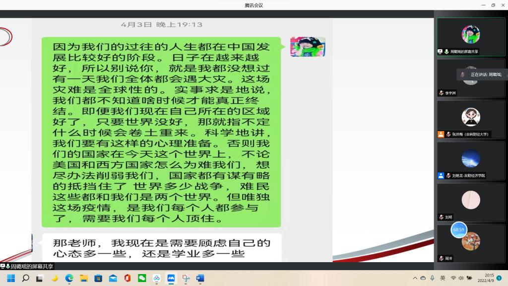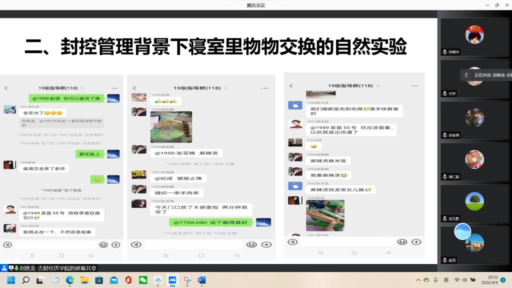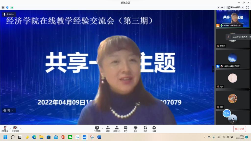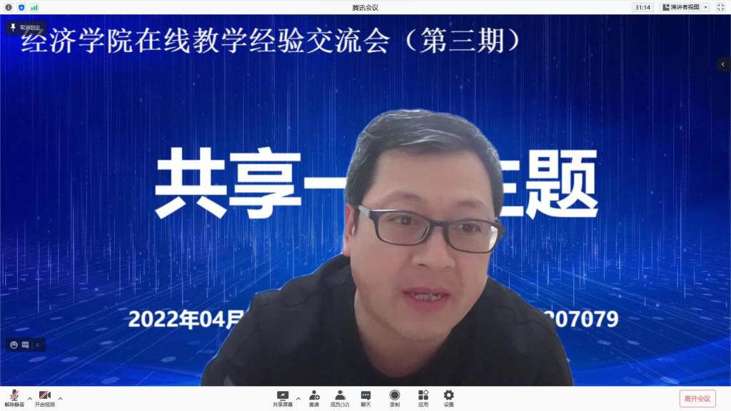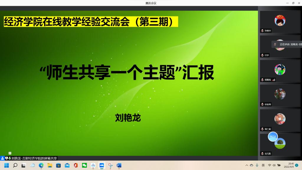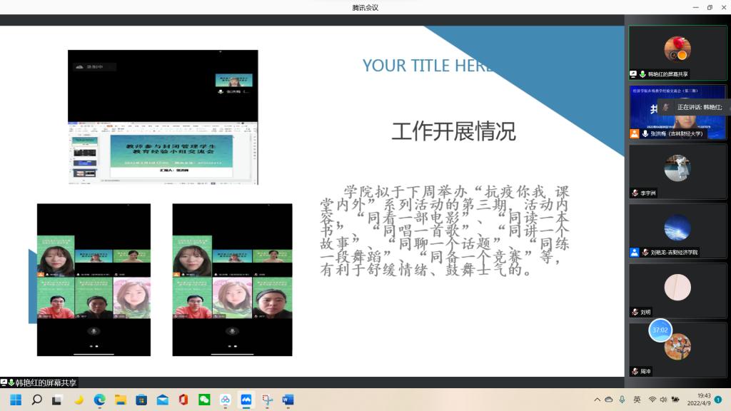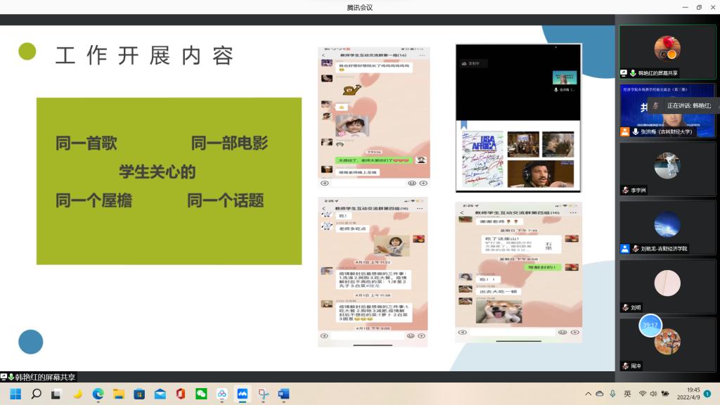 会议伊始,学院领导班子成员分别就疫情防控、教学与学生管理等相关工作向全体教师进行了通报,以确保教职工与学院整体工作同频共振、任课教师与学生工作办公室教师信息对称,保障疫情防控常态下各项工作有序推进。进入会议第二环节,院长张洪梅、副院长王洋和副院长刘艳龙分别汇报所带领的三个小组近两周师生之间开展“共享一个主题”活动情况,并分别选派代表进行具体发言。进行汇报的6位教师分别从“共享一首歌曲”“共开一次班会”“共看一段视频”“共读一本好书”“共聊一个话题”等方面分享了主题活动的开展情况与经验做法。其中,王洋副院长将抗疫元素融入到课程中,做到课程思政润物细无声;刘艳龙副院长用“管理背景下寝室物物交换”的自然实验指导学生拓展居寝生活方式;韩艳红老师采用了“同看一部电影”的方式,致敬抗疫英雄,弘扬抗疫精神。探花视频 教师积极响应号召,将“共享一个主题“活动融入课堂教学,此举持续推进了学院线上教育教学方式创新,力求缩小师生距离,提高学生学习效率。