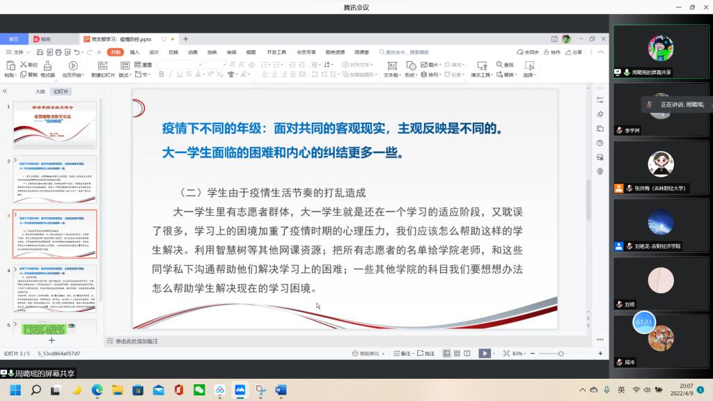 会议最后,张洪梅院长在总结讲话中指出,“共享一个主题”活动的开展,切实地拉近了师生距离,在这一过程中,教师广泛参与,及时了解学生思想动态,帮助学生做好心理建设、学业指导、就业指导,不断加强对学生的疫情防控教育和心理疏导,全体教师勠力同心、共克时艰,打好这场疫情防控阻击战,在践行初心使命中弘扬高尚师德和良好师风。探花视频 全体教师定将团结一致,用不懈的坚守,共同迎来抗疫胜利之时。