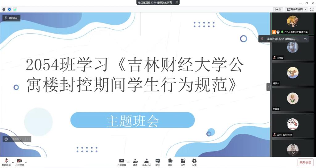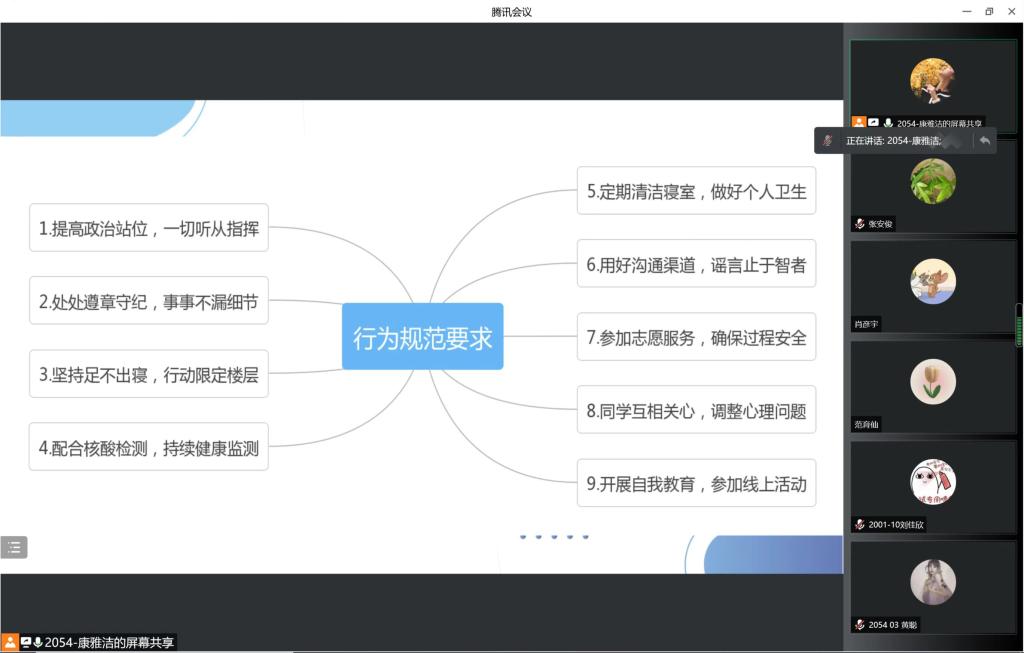 2021级主题班会开始,谷硕老师耐心询问了同学们的学习、生活情况,而后谷硕老师带领全体同学逐字逐句地学习了《探花视频 公寓楼封控期间学生行为规范》,从出寝要求、核酸检测、外出就医、健康检测、个人卫生等方面详细地向同学们介绍了学校的相关防疫政策;同时,谷硕老师就及时沟通、志愿服务、心理调节等方面对同学们表示关心和鼓励;最后,谷硕老师倡议同学们积极参加线上活动和知识讲座,拓宽自己的视野,培养自己的兴趣爱好,平衡好学习和生活问题。谷硕老师着重向同学们解释了商服购物问题:由于货物正在消杀过程中,部分商品可能会延迟送达。因为病毒存在物品传播,只有多轮消杀后才可放心交到同学们手中,所以需要暂时等待;同学们如有急需的物品,可以随时联系老师帮忙解决。