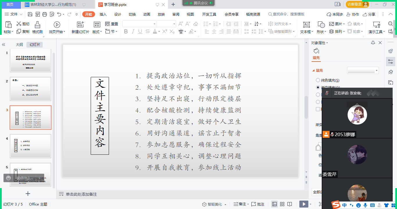 在主持人带领大家逐字逐句学完之后,张安俊老师首先向各位同学表示感谢,感谢自静态管理以来大家对学院工作、学校工作和疫情防控的高度配合与积极支持,感谢大家的坚韧和对困难的克服。之后张老师向大家讲解了学习该文件的背景和必要性,张老师讲到在校党委的坚强领导下经过全校师生的共同努力,大家共同营造、维护了校园的安全与稳定,当前抗疫形势已经显现胜利的曙光,但“行百里者半九十”,越是这个关键时刻,越不能出现思想上的麻痹与松懈,越是要更加严格地执行各项防控措施。随后结合文件,就佩戴口罩、间距2米、卫生间限一人使用,使用前先消杀、严禁串楼串寝、核酸按楼层以寝室为单位推进、每日晨午晚打卡及出现症状及时主动报告、寝室清扫通风、心理关怀和寝室关系等内容做了补充讲解。张老师着重解释了“生活上克服暂时困难,尽量减少商服物品预订”的原因,呼吁大家便利自己的同时便利他人。