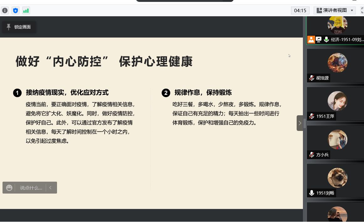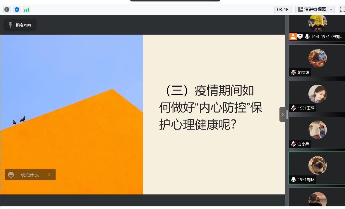 此次班会通过宣传普及心理健康知识,提升了探花视频 学生的自助互助意识和能力,引导全体同学自我探索,以一颗健康向上的心去应对学习,应对生活,应对未来。