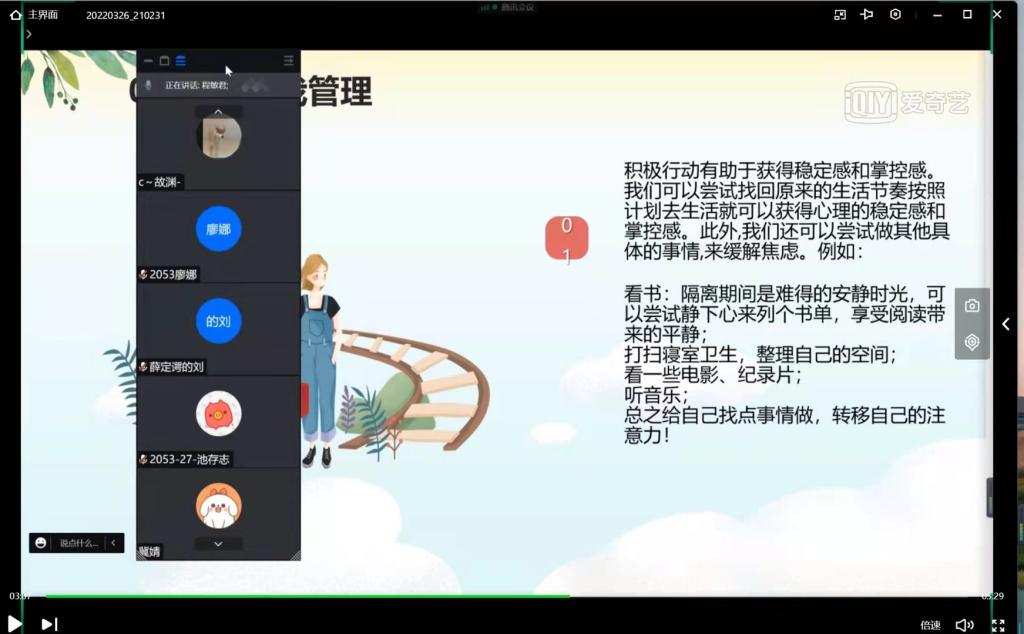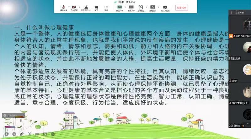 为进一步宣传普及心理健康知识,加强学生心理健康教育,培育学生积极心理品质,促进学生身心健康成长,构建校园和谐文化环境,探花视频 举行以“健康成长 我心飞扬”为主题的班会活动,探花视频 全体在校同学参加。