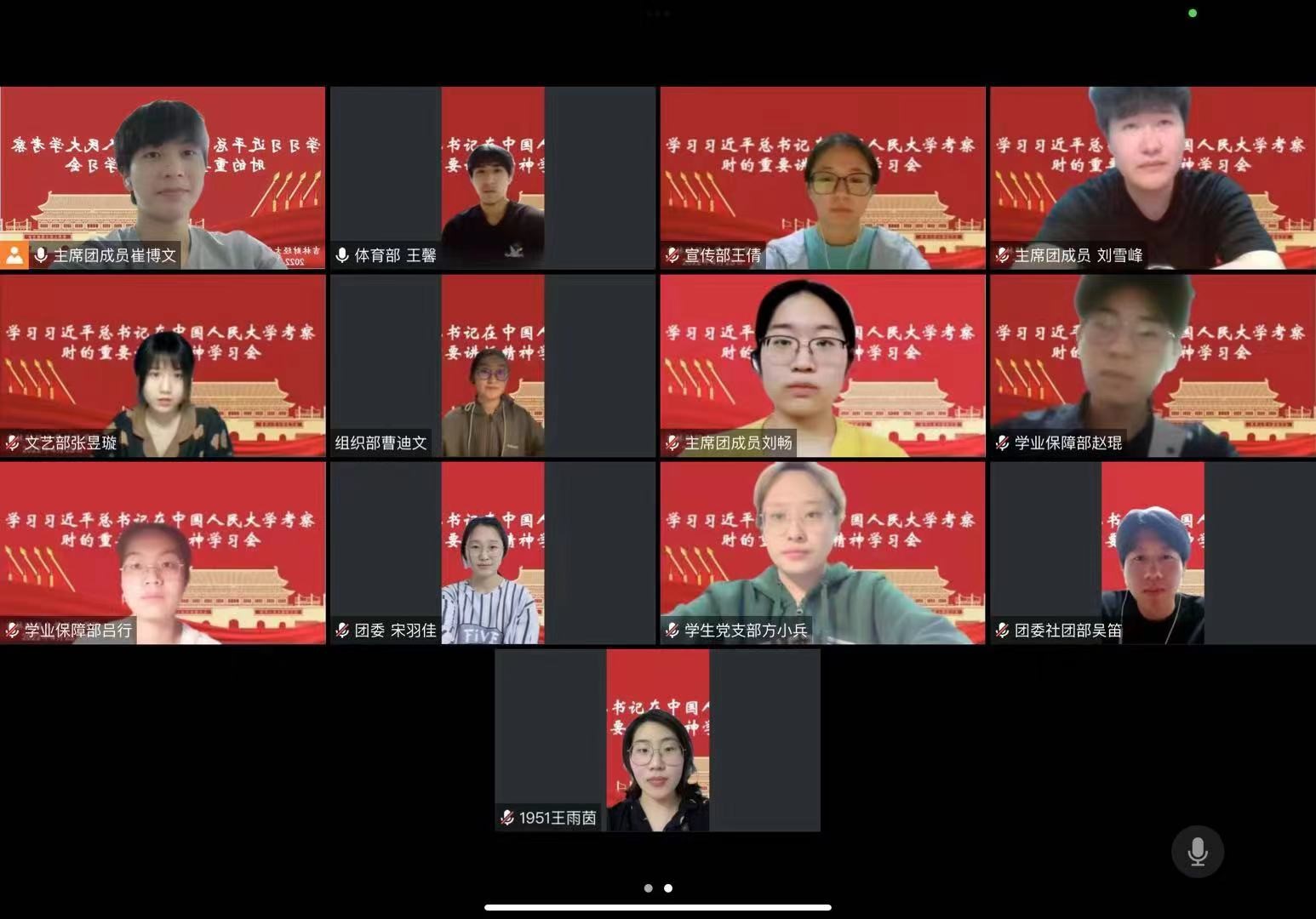 在五四青年节即将到来之际,习近平总书记来到中国人民大学考察调研,并作出重要指示。在中国共产主义青年团成立100周年这个具有特殊意义的时点,为迎接党的二十大胜利召开营造良好氛围的同时加强探花视频 学生会成员的思想建设,探花视频 组织学生会成员深入理解并学习习近平总书记重要讲话精神,牢记党的教诲,立志民族复兴,不负韶华、不负时代、不负人民。