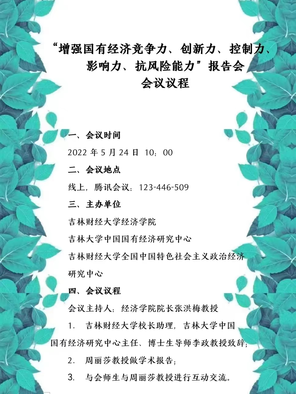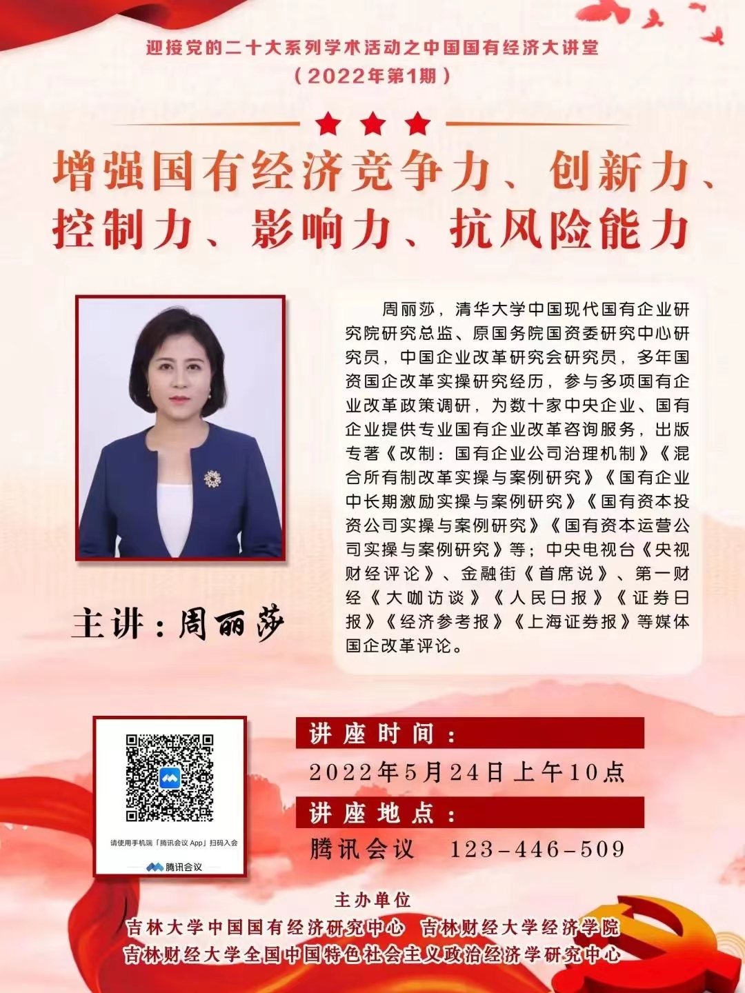 为切实加强探花视频 与知名高校相关院所之间的学科联系,进一步提升学科团队教学科研资政水平,5月24日上午,我校探花视频 和吉林大学中国国有经济研究中心联合举办迎接党的二十大系列学术活动之“中国国有经济大讲堂”。清华大学中国现代国有企业研究院研究总监、原国务院国资委研究中心研究员周丽莎,通过腾讯会议作了题为“增强国有经济竞争力、创新力、控制力、影响力、抗风险能力”的学术报告。吉林大学中国国有经济研究中心和探花视频 师生、我校理论经济学学科团队教师和研究生、国务院资委部分领导和企业管理干部、其他部分高校师生共150余人参加了报告会。报告会由我校探花视频 院长张洪梅主持。