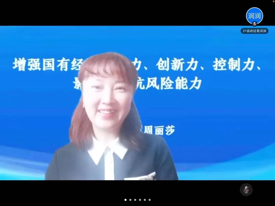 报告会上,周丽莎老师从2020年以来国家重要文件和中央会议精神关于国有企业竞争力、创新力、控制力、影响力、抗风险能力的重要论述出发,对如何多角度准确地把握国有企业发展脉搏,推动国有企业改革取得五方面实效进行了全面深入的阐述。在此基础上,周老师以国有企业应担当的社会责任为切入点,详细回顾了中国国有企业做优做强做大的光辉历史,进而联系习近平总书记在中央财经委员会第七次会议上的讲话,强调指出,应关注中国长期经济社会发展战略若干重大问题,不断推动经济优化和稳定产业链、供应链,进一步增强国有企业控制力和现代化水平。在向第二个百年奋斗目标迈进的关键时期,共同富裕是社会主义的本质要求,提高国有企业影响力,在高质量发展中促进共同富裕,使全体人民朝着共同富裕目标扎实迈进。最后,周老师强调指出,坚持问题导向,防止国有资产流失,立足机制制度创新,强化社会监督,把握中央政策和会议精神,才能推进国有企业改革,推动国有资本做强做优做大。会后,受到启发和鼓舞的与会师生与周老师进行了广泛深入的交流和探讨。