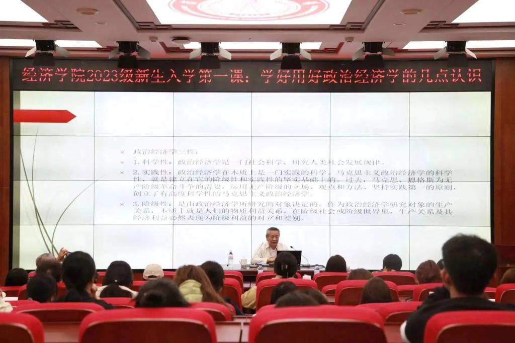 宋冬林从什么是政治经济学、为什么要学习政治经济学、如何学好政治经济学三大方面展开分析,并着重讲述了要从“马克思主义政治经济学与现当代资本主义生产关系的矛盾运动”“马克思主义政治经济学与现当代社会主义生产关系的矛盾运动”“马克思主义政治经济学与人类社会生产关系的矛盾运动”三个维度审视马克思主义政治经济学的发展。其次,宋冬林结合经济社会发展的实践问题为大家讲述了政治经济学的含义,联系芯片之争、中国式现代化的奇迹和百年未有之大变局等现实问题,指出学习政治经济学能够帮助我们正确认识社会历史发展的必然趋势,坚定社会主义理想信念和树立共产主义世界观,掌握我们建设社会主义市场经济的一般理论,更好地理解党和政府的经济政策等。最后,宋冬林阐述了如何学好政治经济学,他建议同学们通过研读原著、理解概念、认识范畴来把握好政治经济学的理论精髓和实质,同时鼓励大家直面现实经济生活,发现问题,探索问题,解决问题。