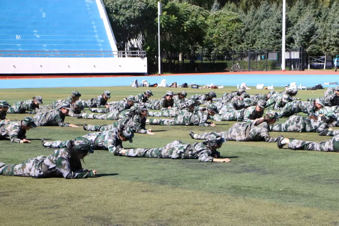 除基础队列训练外,还有匍匐前进与军体拳练习,让新生们在磨砺中亮出铮铮铁骨。练习匍匐前进时,新生们俯身贴地,膝盖、手掌磨得发红沾泥,却无一人放慢速度,个个眼神坚定、咬牙向前,硬是凭着一股“不认输”的劲,把每一次挪动都走得扎实有力。军体拳训练中,“哈!哈!”呐喊声震彻操场。新生们出拳迅猛、踢腿刚劲、格挡有力,哪怕重复动作到手臂发僵,喊杀声依旧洪亮,每一个招式都透着股不服输的狠劲,将军人的果敢与少年的韧劲融在一起,尽显青春锋芒与钢铁意志。