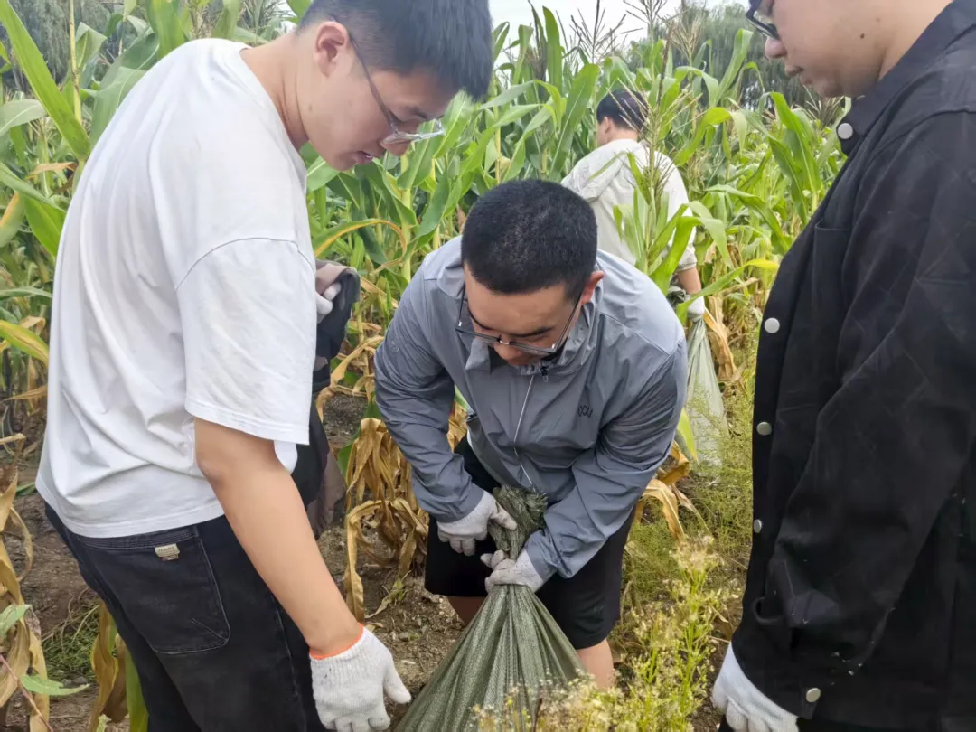 头顶炎炎烈日,脚踏泥泞土地,同学们相互帮扶、团结协作。尽管劳动环境艰苦,但这丝毫未能抑制他们的劳动热情。很快,一颗颗翠绿的玉米便被装入了麻袋。