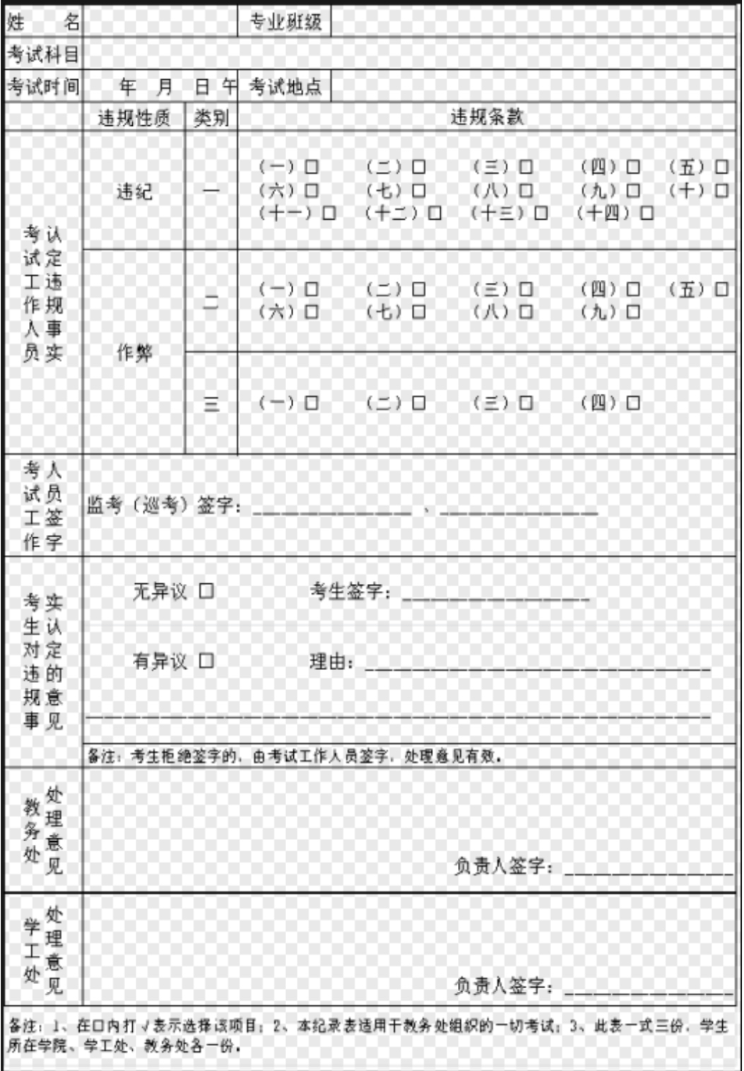 学生考试违规记录单》(见附件,下简称违规记录单);对考生用于作弊的材料、工具等,应予暂扣。