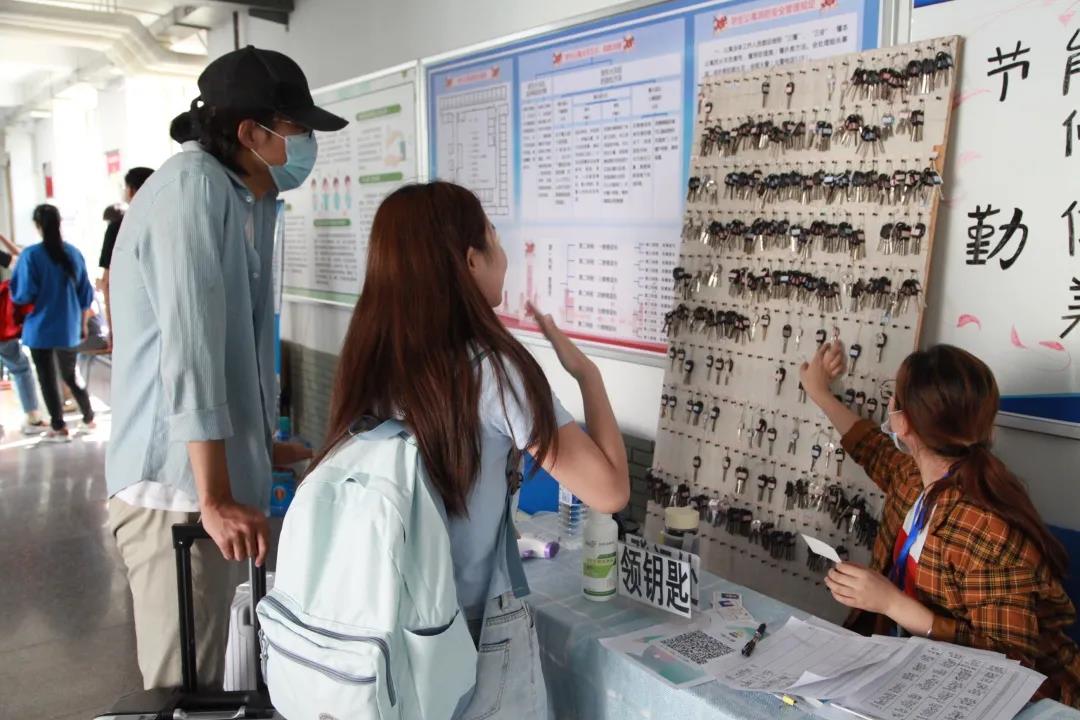 迎新工作人员热情地接待每一位新生,迅速引领新生完成注册一系列手续,帮助新生搬运行李,找到宿舍领取钥匙安置住宿。在全体人员的配合下,迎新工作有条不紊的顺利开展。